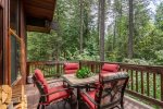 Dining area and access to the private deck with a gas grill and outdoor furniture—ideal for relaxing under the trees